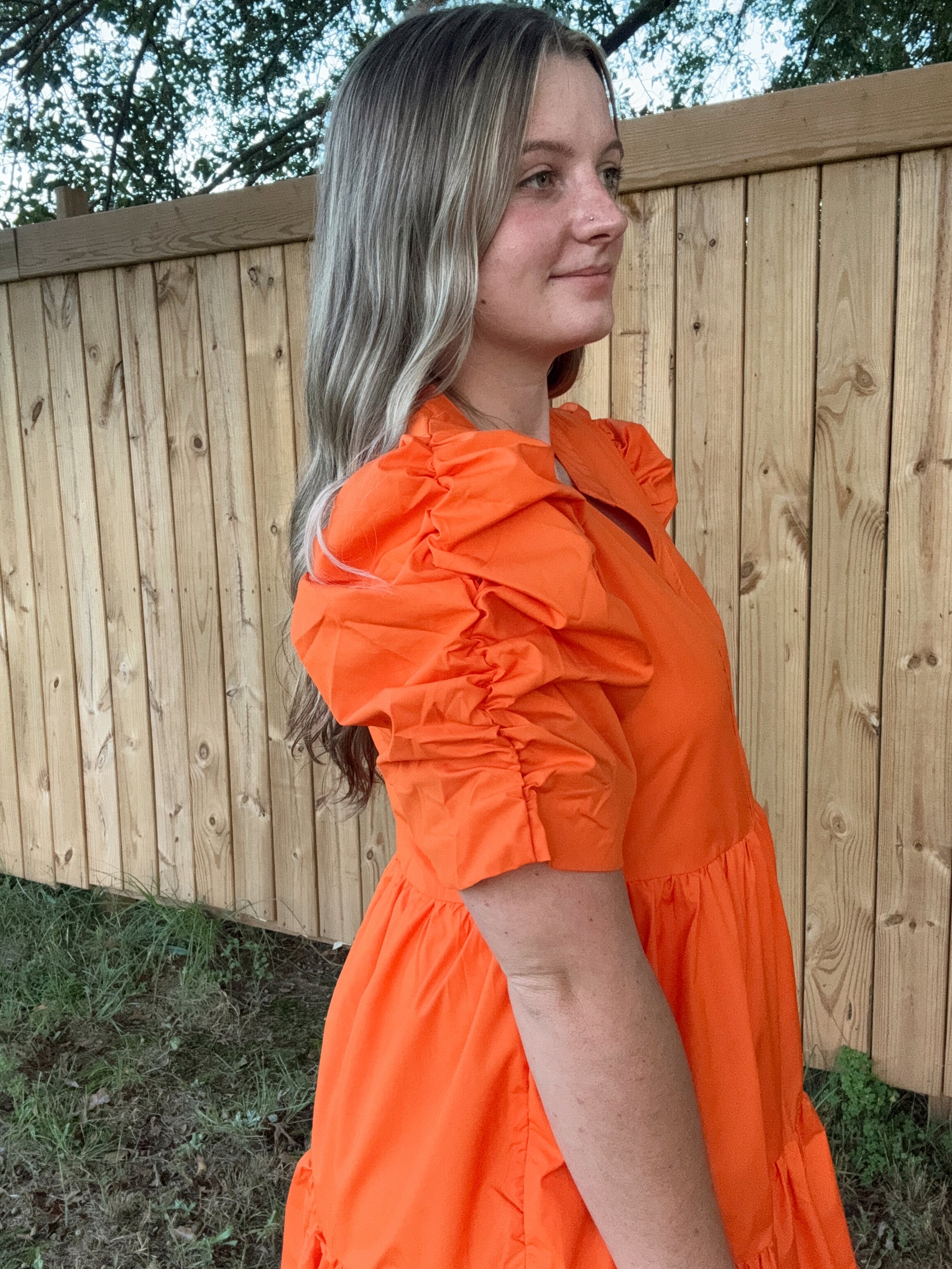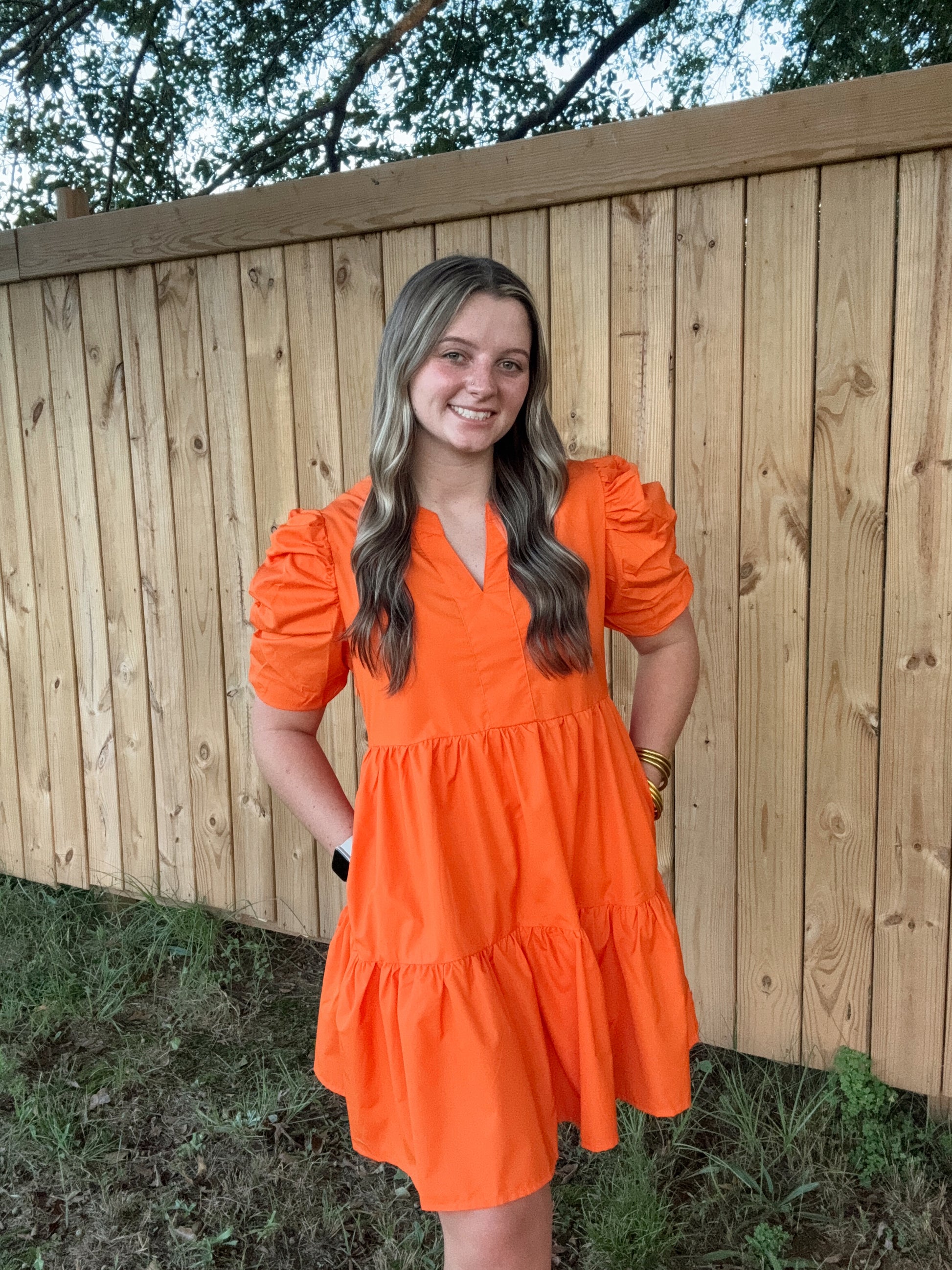The Notched Dress is a tiered dress with puff sleeves. The perfect dress for gameday!